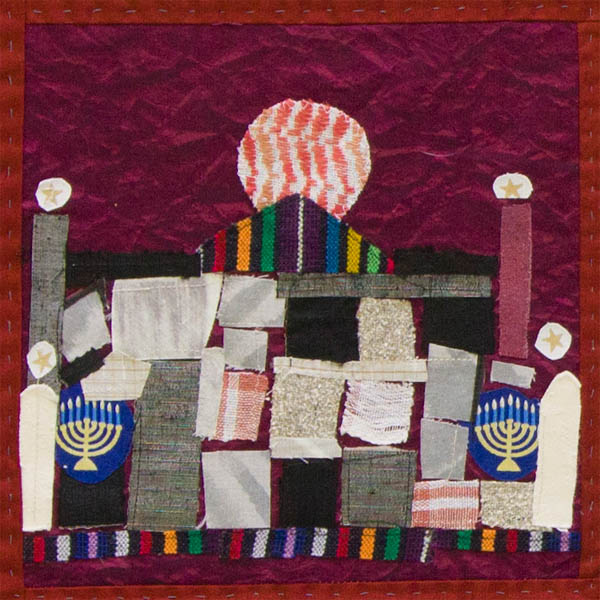 A composite of the Western Wall-made of Israeli stones, mosque-like dome, menorahs and material from a man's keffiya.