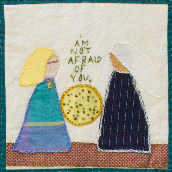 In the spring of 1987 my husband and I spent an afternoon in a Palestinian home in a refugee camp in Jordan. For hours we were served a lavish feast by a quiet doting older woman. When she learned that we were Jewish, her reaction was "I am not afraid of you." (She had been a young girl in a neighbouring village at the time of the Deir Yassin massacre.) I was shocked and shaken. It had never occurred to me that my being Jewish might create fear in someone (although it seemed very normal for me to be afraid of someone who was an Arab!) This woman made an enormous impact on me with those words and forever changed the way I see the Jewish/Arab conflict. If we just treat each other as individual good people and discard the fear and stereotypes, we could live with each other. I purposely embroidered the words on this square so that it is not clear who is saying them.