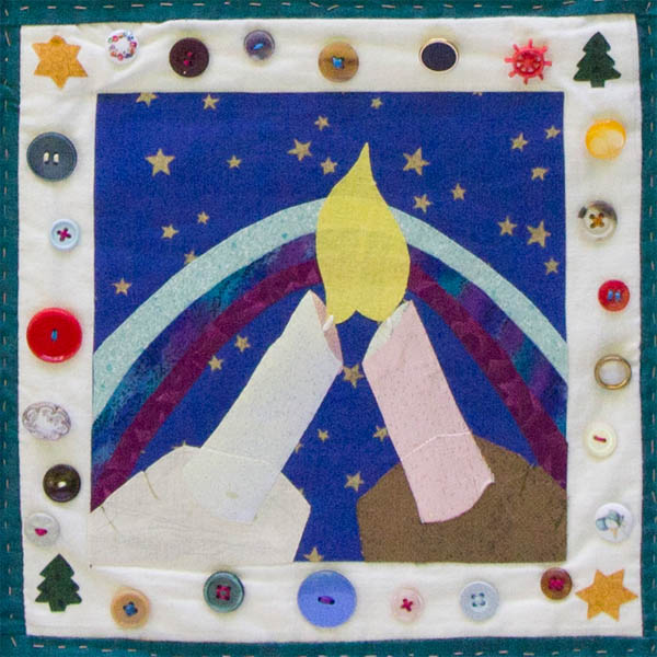 The square that we created contains a rainbow, on top of which are two hands holding candles which come together to share a single flame. Around the border of this square buttons of many colours are sewed with many different colours of thread. At two of the corners the star of David has been placed, and at two corners, the cedar tree.